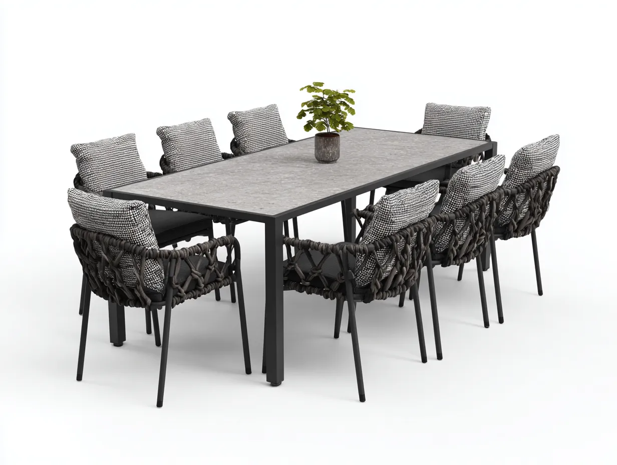 Salon de jardin repas table et chaises en métal et corde tressée 220x100x75 cm gris et noir pour extérieur - style contemporain